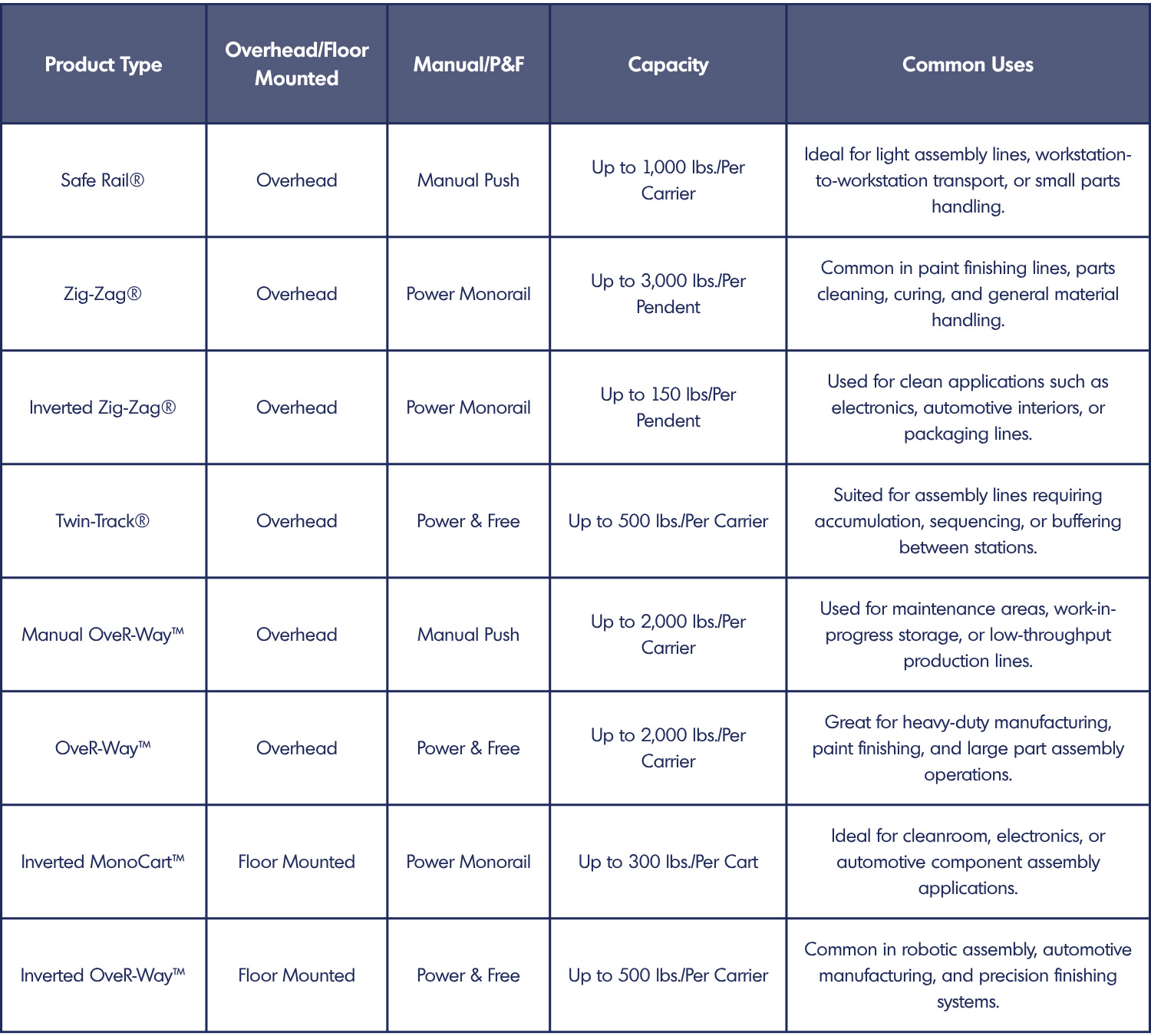 At the most basic definition, there are two types: Floor and Overhead. After that, the application dictates the model and design. Below are our trademarked systems and a general overview of differing characteristics.